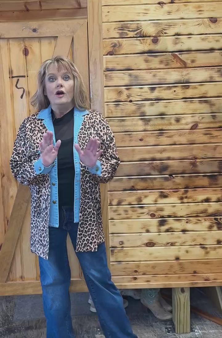 Channel your inner wild spirit with this stunning lightweight leopard print thermal jacket/top from Lucky & Blessed. The contrast denim collar and cuffs add a touch of rugged charm, while the structured silhouette brings a polished, feminine edge. Antique brass buttons and soft brushed fabric give this piece that vintage ranch feel you love, wrapped in all-day comfort.