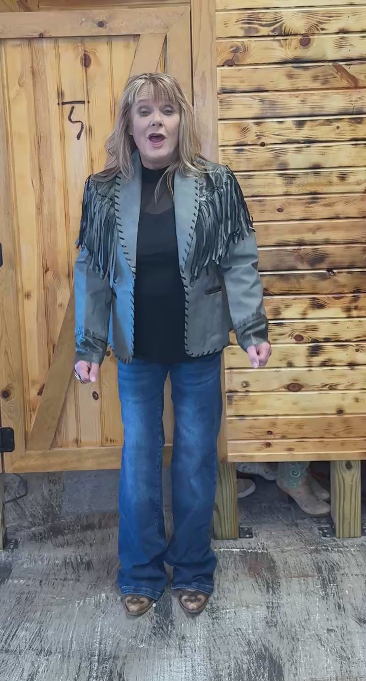 Step into timeless Western glam with the Charcoal Black Fringe Trimmed Blazer Jacket from Lucky & Blessed Fall 2025 Collection. Crafted for the modern cowgirl, this tailored blazer features premium faux leather in a washed charcoal finish, accented with dramatic long fringe along the front, back yoke, and sleeves.